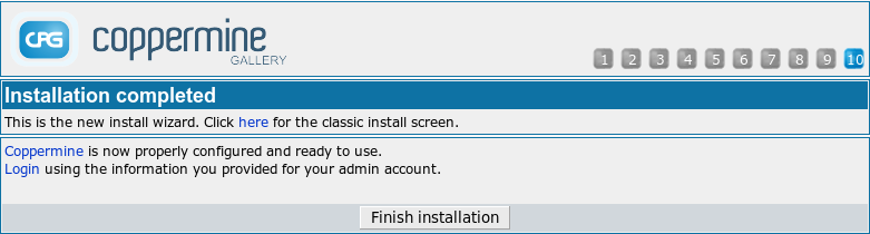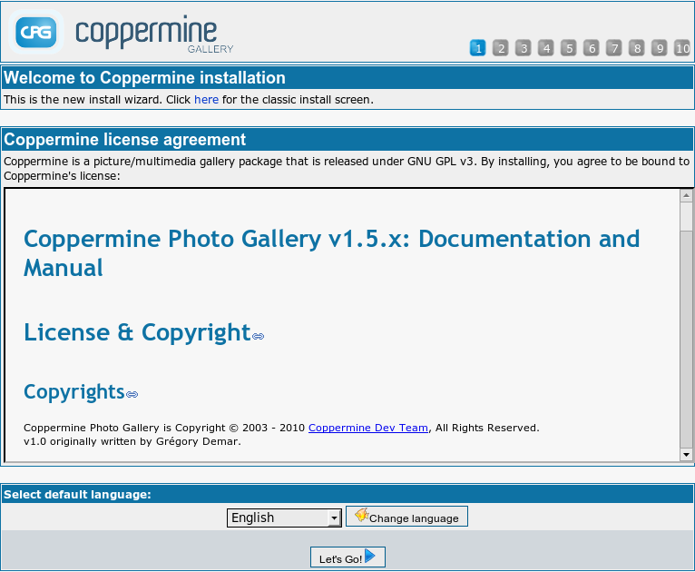 On the initial screen of the wizard you will see the license disclaimer that coppermine comes with. If you don't accept the license, you're not allowed to continue the install wizard. You can re-read the license at any later time (after having completed the installer) by going to this documentation and navigating to "Coppermine documentation" → "License & Copyright".