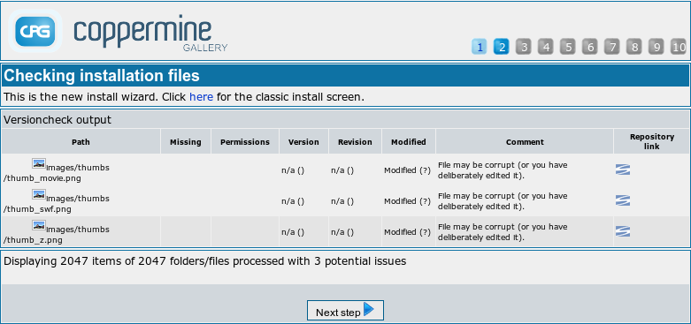 In the second stage of the installer a check is performed if the package you are about to install is actually the most recent one. This is meant to make sure that you are actually installing the most recent version of Coppermine, where all known bugs and issues have been fixed. Usually, if you have just downloaded Coppermine from the official Coppermine download at sourceforge.net you should be good. If the installer complains that you don't have the most recent version you should get the most recent version first before continuing. The only exception to this rule is if you are not using an official package (downloaded from the official Coppermine download section), but a subversion checkout: the version/revision counter is not being kept up to date between releases, so if you use a subversion checkout, it's expected behaviour that some files are being displayed as outdated. If you have no idea what a subversion repository is, this exception obviously doesn't apply for you.