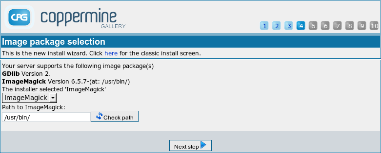 Coppermine needs an image library to be present on the server (see minimum requirements → image library). Currently, GD and ImageMagick are supported. In this stage of the install wizard, various checks are being performed to determine what image library you have available on your server. Usually, you can just continue to the next step if at least one library is found. If the installer complains that it couldn't find an image library, you will have to manually specify it. You can't make this up, nor will coppermine install an image library for you - it's part of the minimum requirements to have one. If you don't have one of the supported image libraries, you won't be able to use coppermine.