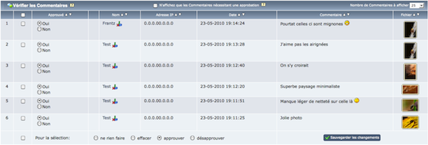 Dans la page "voir les commentaires" l'administrateur peut lister tous les commentaires postés les classer selon différents critères. Vous pouvez marquer commentaires comme approuvées ou non, et vous pouvez également supprimer des commentaires.