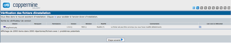 Cliquez sur "étape suivante" si tous les fichiers sont à jour ou si vous ne souhaitez pas utiliser la version la plus récente (ou plutôt: si vous connaissez la méthode suffisamment bien pour être sûr que ce que vous vous apprêtez à installer est effectivement ce que vous voulez). En fait ce qui se passe à cette étape est que la copie incorporée exécute le vérificateur de version de script qui est livré avec Coppermine afin de déterminer si votre copie de Coppermine que vous êtes sur le point d'installer est mise à jour, puisque vous ne voudriez pas d'installer une copie périmée pour commencer.