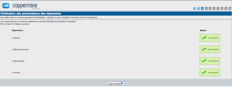 Coppermine doit avoir les droits en écriture dans certains sous-répertoires comme expliqué dans Paramètres des permissions. L'installateur ne peut pas définir ces droits pour vous, vous devez le faire vous même auparavant. Si vous l'avez fait correctement, tous les répertoires vérifiés par l'assistant d'installation devraient être marqués "OK". Si ce n'est pas le cas pour vous (si l'installateur vous signale des manques pour un ou plusieurs répertoires), laissez l'écran du navigateur comme il est et allez paramétrer les droits correctement. Une fois fait, revenez à l'écran d'installation et rafraichissez la page pour voir si le problème des droits est résolu.