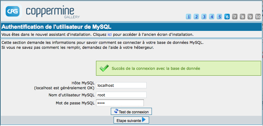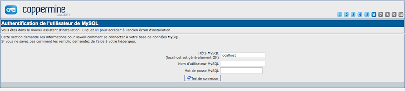 Pendant cette étape, vous devrez entrer vos données de connexion MySQL. Vous ne pouvez pas falsifier les informations MySQL pendant l'installation, vous devez les connaître avant et entrer les informations comme demandé. Si vous n'êtes pas sûr de la valeur des informations nécessaires, demandez votre hébergeur. L'équipe de développement de Coppermine ne sera pas en mesure de vous dire ce que vous devrez entrer à cet endroit - vous devrez demander à votre hébergeur pour cela.