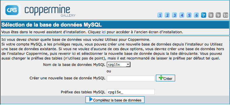 Si votre compte MySQL a les privilèges nécessaires, vous pouvez créer une nouvelle base de données depuis l'installateur, ou utiliser une base de données existante. Si vous n'aimez aucune de ces deux solutions, vous devrez créer d'abord une base de données en dehors de l'installateur de Coppermine, puis revenir ici et sélectionner la nouvelle base de données dans la liste déroulante.