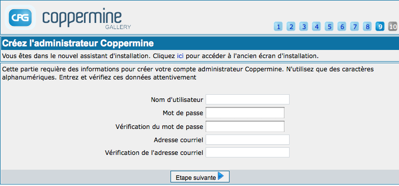 La version cpg1.5.x change beaucoup des versions précédentes et la méthode d'installation est particulièrement concernée: toutes les versions de Coppermine ont un installateur, mais dans cpg1.5.x, le processus d'installation à été entièrement refait: l'installateur par défaut a maintenant été pourvu d'une interface semblable à un assistant, ou vous pouvez faire une étape à la fois. Vous serez accompagnés pendant l'ensemble du processus d'installation en utilisant l'assistant, ce qui est une grande avancée pour les utilisateurs débutants. Néanmoins, si vous êtes un expert de Coppermine et que vous savez ce que vous faites avec cette application, vous pouvez toujours utiliser l'ancien écran d'installation: nous l'avons inclue dans le pack sous le nom de "classic installer". Merci de noter qu'il n'y aura pas d'aide pour cette méthode: si vous avez des problèmes lors de l'installation et que vous voulez de l'aide, utilisez le nouvel installateur. Les questions relatives à l'ancien installateur resteront sans réponses sur le forum de Coppermine. Bien entendu, l'ancien installateur ne comprend pas toutes les fonctions du nouvel installateur: il ne crée pas la base de données pour vous etc.