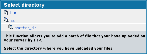 FTP-uppladdningar och batch-uppladdningar är en för administratören av galleriet rekommenderad metod för att ladda upp filer. Av säkerhetsskäl kan bara administratören göra detta; icke-administratör kan inte använda den här funktionen och behöver använda en av de andra metoderna för att ladda upp filer.