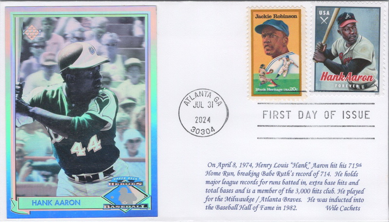 | | Cachetmakers Contest - Winners | | 12 | 5908 | 7/31/2024 | Hank Aaron; Wile Cachets; Category 06: Miscellaneous Medium; Third Place; Hologram Baseball Card attached with printing added | $25.00 |