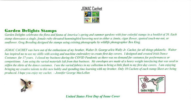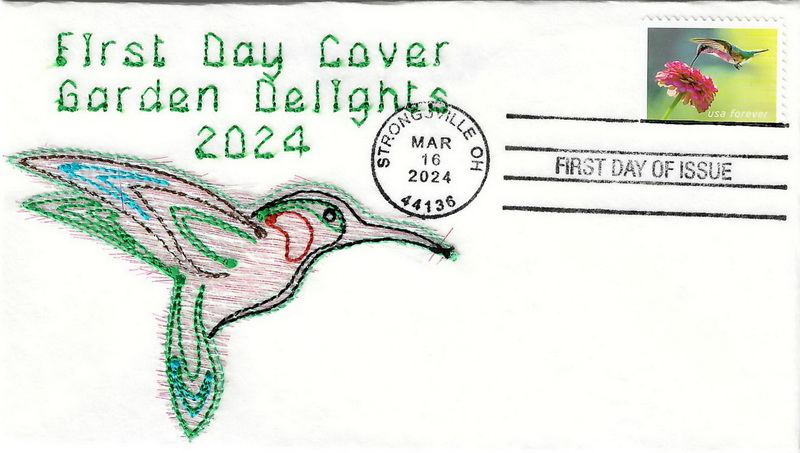 | | Cachetmakers Contest - Winners | | 14 | 5847 | 3/16/2024 | Garden Delights, Ruby-throated Hummingbird and Zinnia; JGMAC Cachet; Category 07: Esoteric or Unusual; Stitched art; Third Place; 15 made | $40.00 |