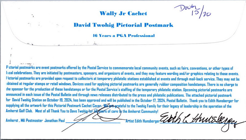 | | Cachetmakers Contest, Events | | 50 | Event | 10/19/2024 | 46 Years of PGA Service - Amherst Golf Club; Wally Jr. Cachet; PHC; 20 made | $20.00 |
