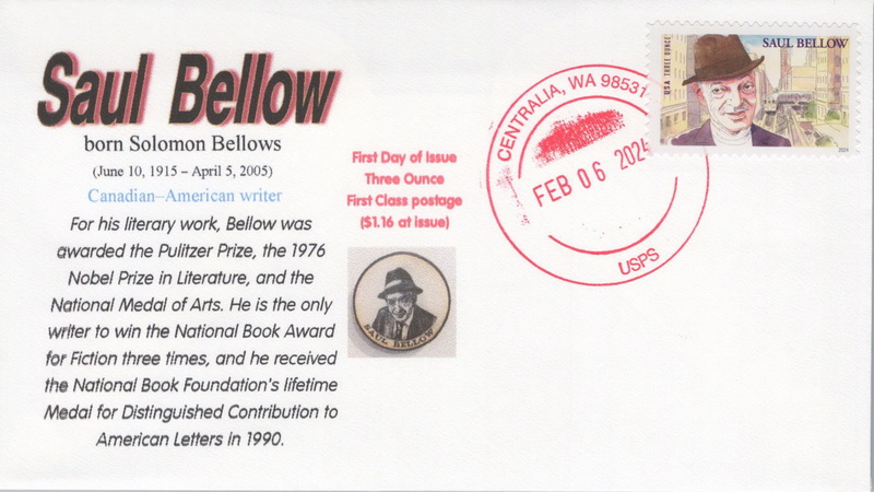 | | Cachetmakers Contest - Other Entries | | 71 | 5831 | 2/6/2024 | Saul Bellow; Gelvin, Dennis J.; UO Centralia WA; USPS CDS | $12.00 |