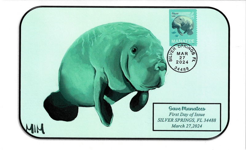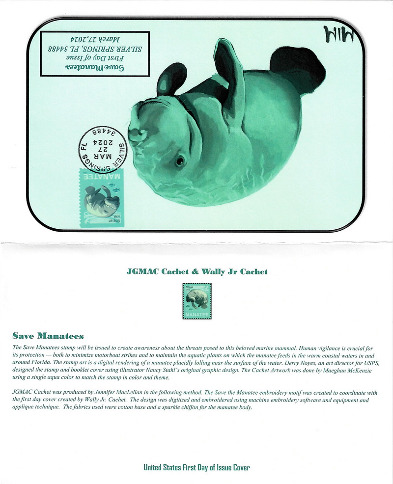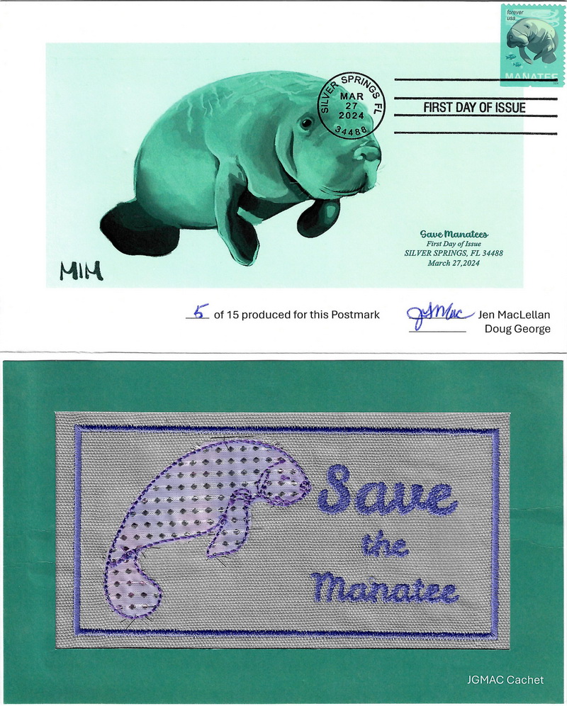 | | Cachetmakers Contest - Other Entries | | 91 | 5851 | 3/27/2024 | Save Manatees; JGMAC Cachet & Wally Jr. Cachet; Bi-fold card with stitched art mounted inside; 15 made | $50.00 |