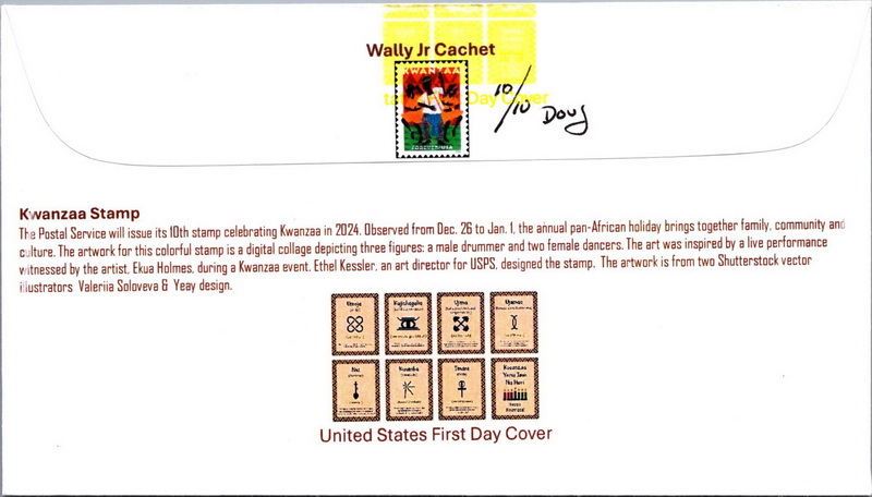 | | Cachetmakers Contest - Other Entries | | 145 | 5946 | 9/25/2024 | Kwanzaa; Wally Jr. Cachet; BHC; 10 made | $15.00 |