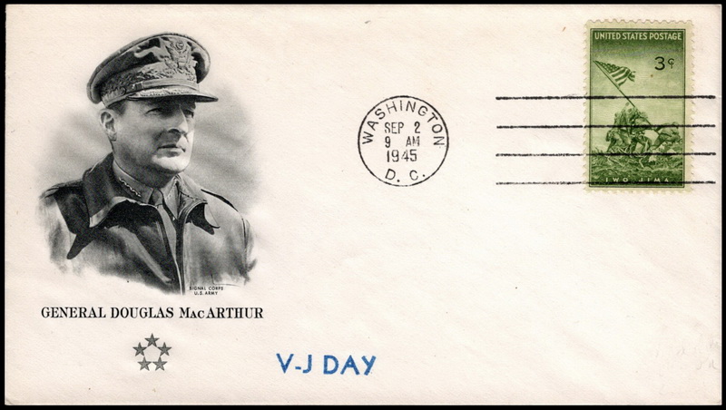 | | ArtCraft | | 234 | Event | 9/2/1945 | V-J Day; ArtCraft; WWII Patriotic; General MacArthur; black; Washington DC MC4 9AM; with "V-J DAY" rubber stamp | $20.00 |