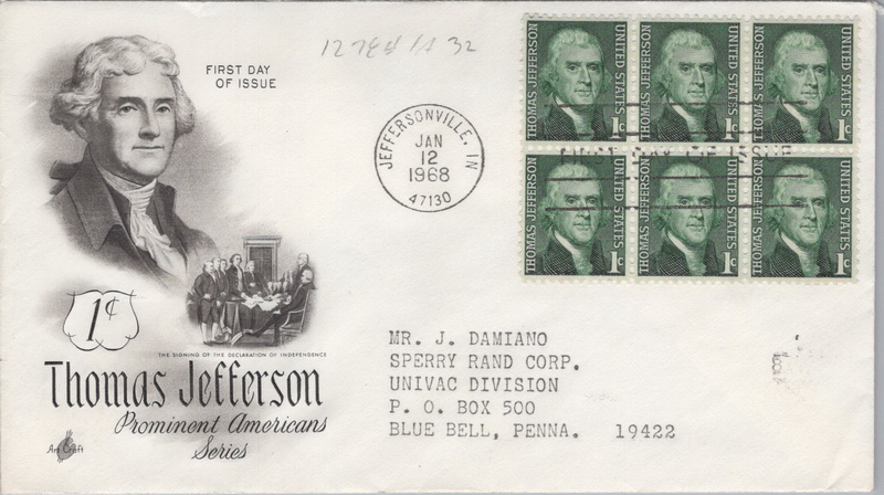 | | ArtCraft | | 244 | 1278 | 1/12/1968 | Thomas Jefferson ; ArtCraft; Advertising - AMP INCORPORATED, Harrisburg, PA; With enclosure | $8.00 |