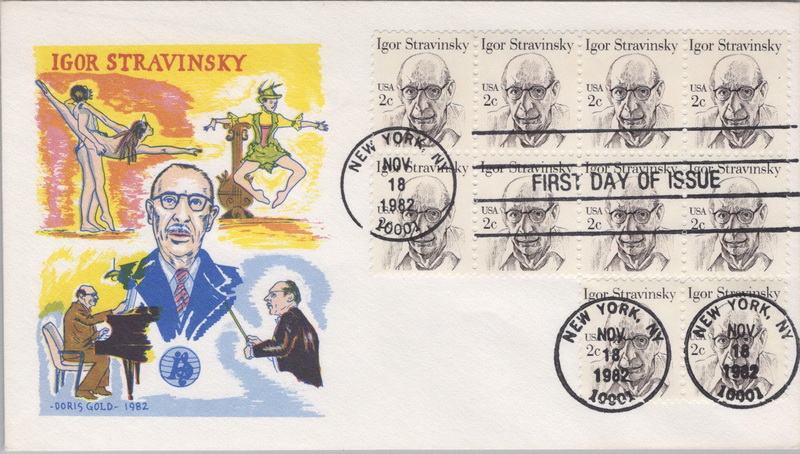 | | Doris Gold Cachets | | 328 | 1845 | 11/18/1982 | Igor Stravinsky; Doris Gold Cachets | $8.00 |
