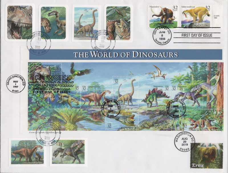 | | H. N. Local Post | | 479 | 3079 | 6/8/1996 | Prehistoric Animals, Mastodon; H. N. Local Post; With #3080; Dual FDOI #3136 top-half sheet, #5411 T.rex, and Detroit MI Philatelic Boutique cancel on faux dinosaur stamps; #3079 and #3136f with "H.N" perfins | $30.00 |