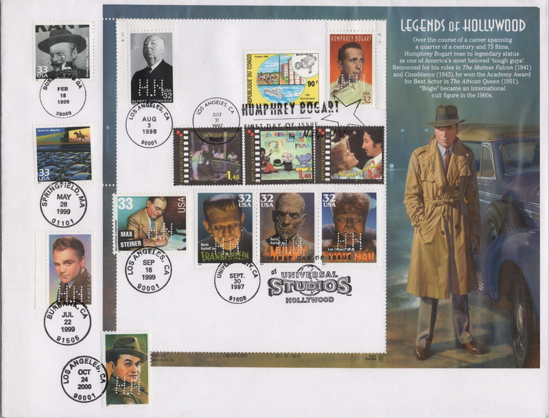 | 482 | 3152 | 7/31/1997 | Humphrey Bogart; H. N. Local Post; Combo foreign stamps with Dual FDOI: 1997 Movie Monsters, 1998 Hitchcock, 1999 Orson Welles, 1999 Drive-In Movies, 1999 James Cagne, 1999 Max Steiner, and 2000 Edward G. Robinson; Most U.S. stamps with "H.N" perfin | $30.00 |