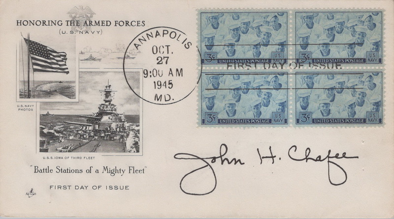 | | Autographs - Famous People | | 689 | 0935 | 10/27/1945 | US Navy; ArtCraft; M14; Autographed by John H. Chafee; 1963-1969 Rhode Island Governor, 1969-1972 Secretary of Navy, 1976-1999 Senator