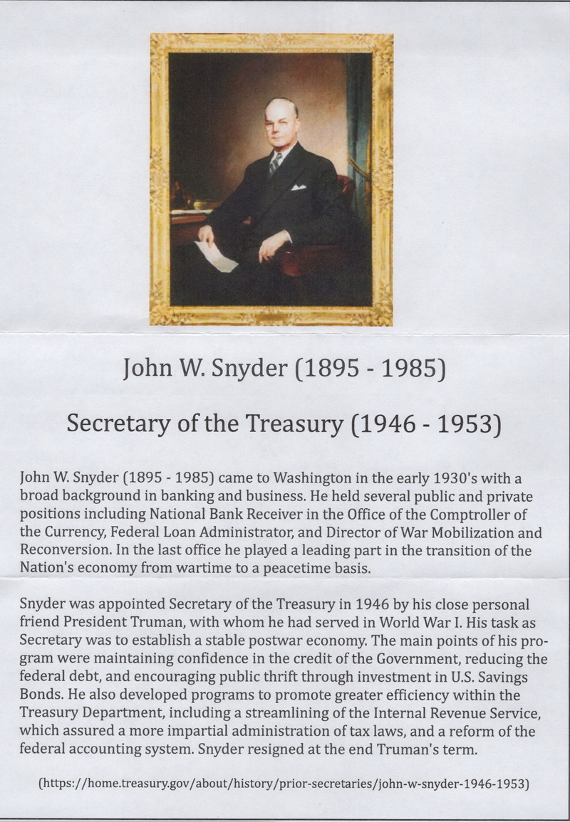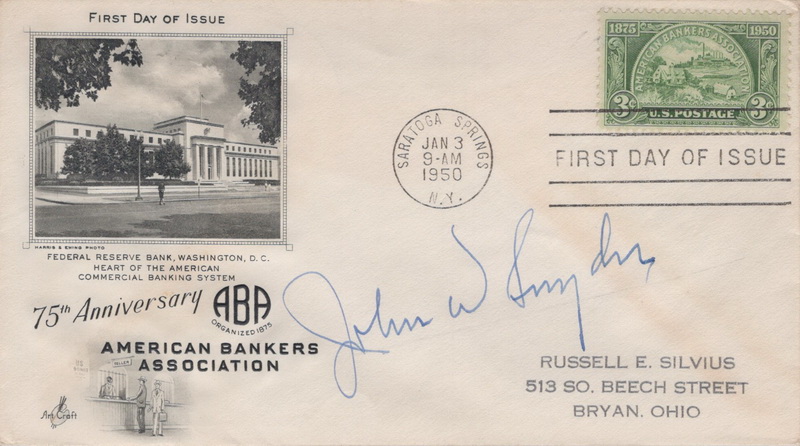| | Autographs - Famous People | | 699 | 0987 | 1/3/1950 | American Bankers Association; ArtCraft; M4; Signed by John W. Synder, U.S. Secretary of the Treasury 1946-1953; MC RSA | $20.00 |
