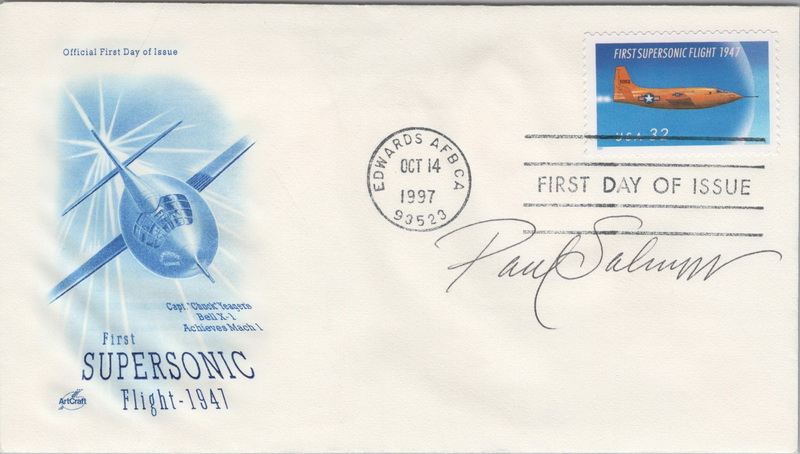 | | Autographs - Philatelic | | 708 | 3173 | 10/14/1997 | Supersonic Flight, Charles Yeager; ArtCraft; Signed by Artd Work Illustrator, Paul Salmon | $15.00 |
