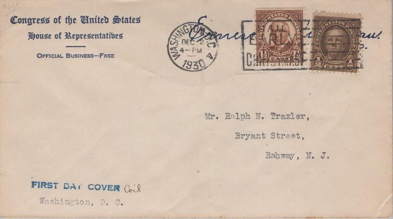 | | 1930s | | 764 | 0686 | 12/1/1930 | Harding, Perf 11 x 10.5; PNLBC; Congress of the United States House of Representatives; Washington DC SMC 4PM TA SF; Second Day | $20.00 |