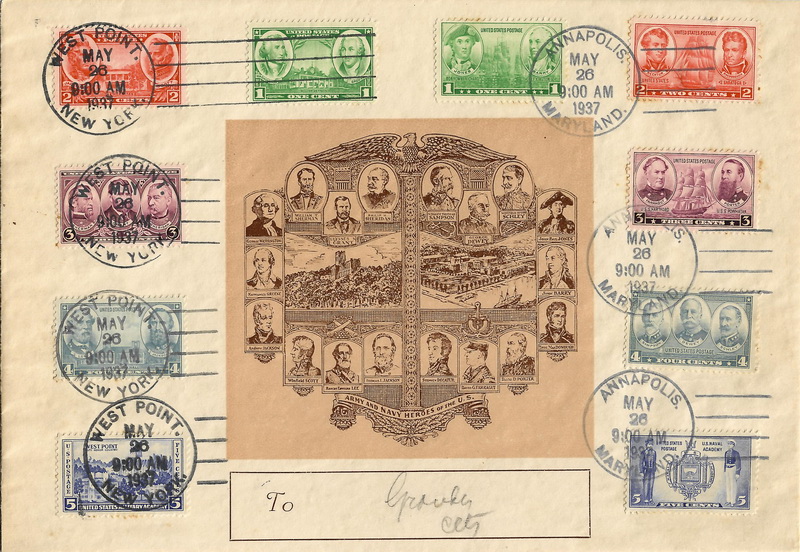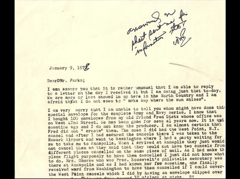 | 792 | 0794b | 5/26/1937 | Army-Navy, 1c-5c Combination (10 stamps); Dietz, Frederick Henry; P62; Army Series cancelled West Point NY, and Navy Series cancelled Annapolis MD; 100 serviced by Winfred Grandy - with provenance written on the back by Grandy, and a partial typed letter to M. Douglas Parks in 1978 | $150.00 |
