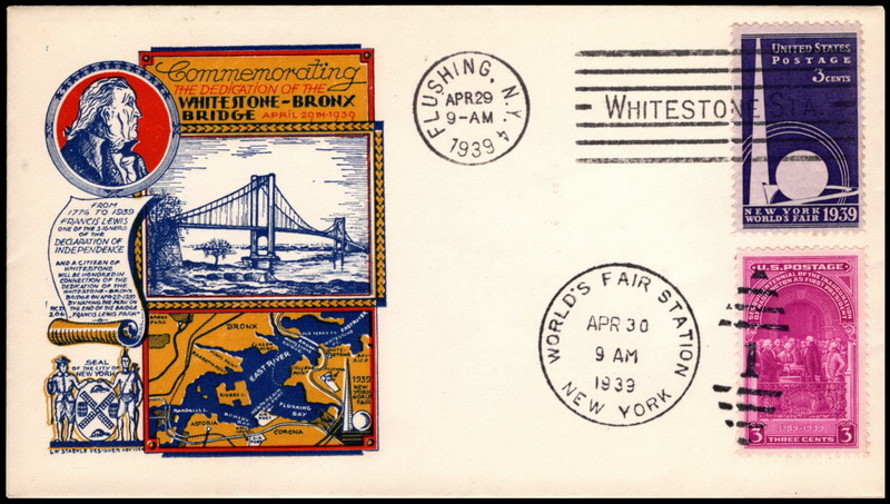 | | 1930s | | 805 | Event | 4/29/1939 | Staehle; Dedication of Whitestone-Bronx Bridge; Flushing NY; SMC; Dual cancel World's Fair Opening Day | $15.00 |