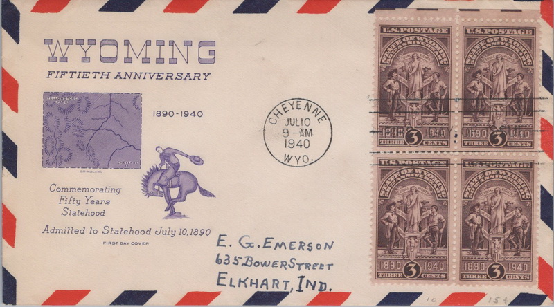 | | 1940s | | 822 | 0897 | 7/10/1940 | Wyoming Statehood; Grimsland; M11, airmail envelope, B4 MC IA | $12.00 |