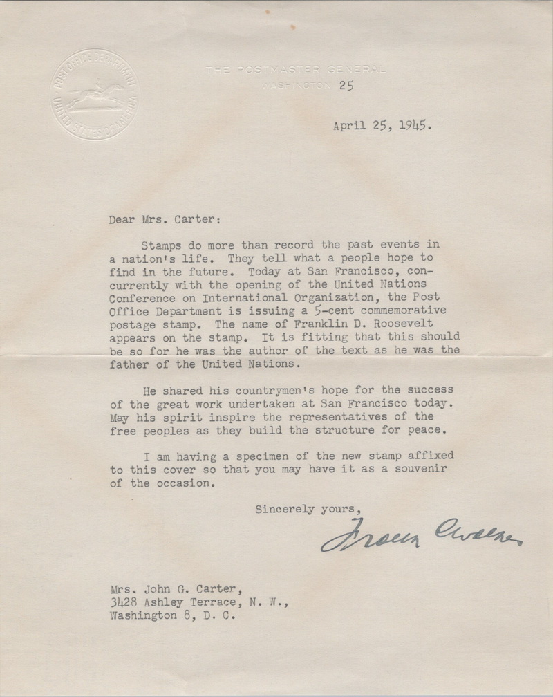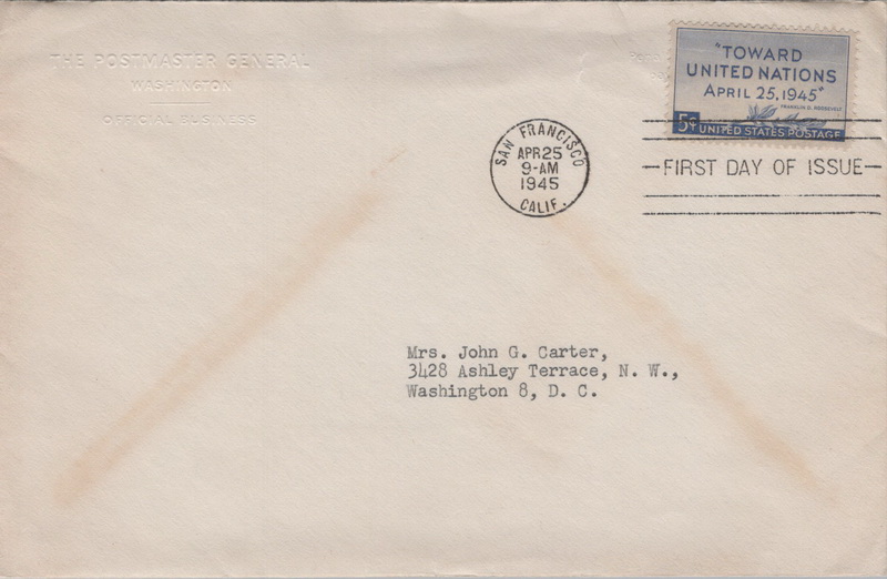 | | 1940s | | 859 | 0928 | 4/25/1945 | United Nations; United States Post Office Department; MNL; Postmaster General embossed BCC; with letter; open top | $40.00 |