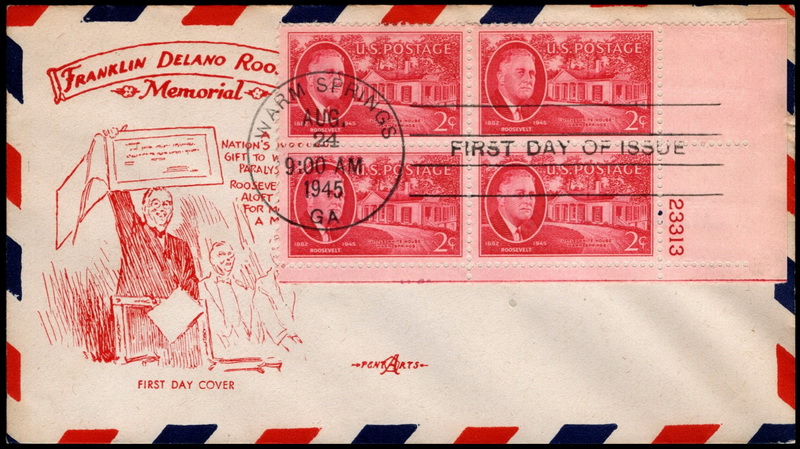 | | 1940s | | 862 | 0931 | 8/24/1945 | Franklin D. Roosevelt, Warm Springs; Pent Arts; M13h; red on airmail envelope; LR PB4 #23313 HC UA | $20.00 |