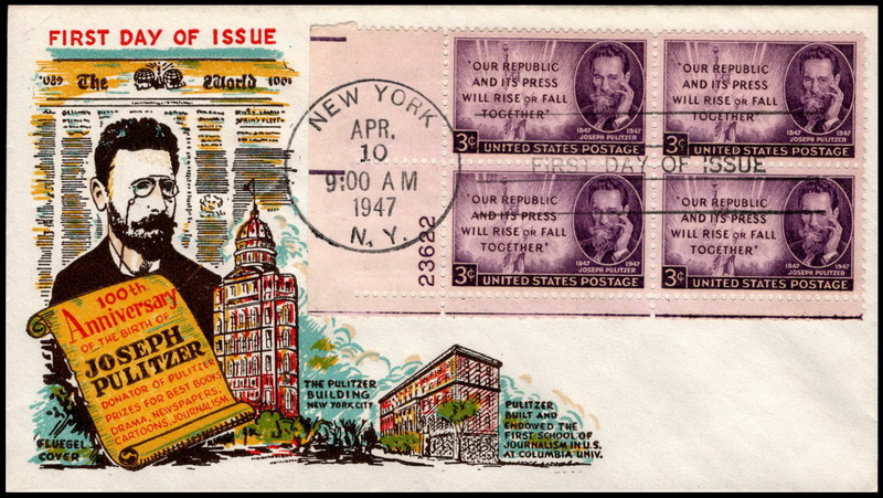 | | 1940s | | 891 | 0946 | 4/10/1947 | Joseph Pulitzer; Fluegel; M13; LL PB4 #23622 | $25.00 |