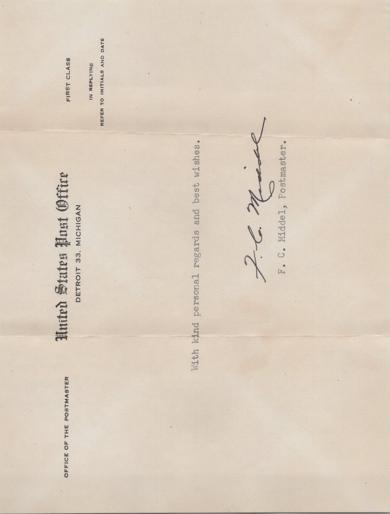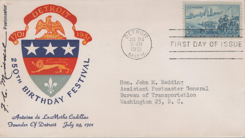 | | 1950s | | 907 | 1000 | 7/24/1951 | Landing of Cadillac; Butzen/Heath; M38; blue/red/yellow/gray; MC TA; Signed by Postmaster; with letter | $15.00 |