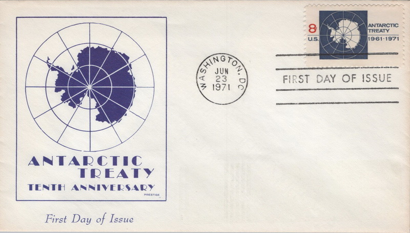 | | 1970s | | 966 | 1431 | 6/23/1971 | Antarctic Treaty 10th Anniversary; Prestige Reaction; deep blue; with enclosure | $10.00 |