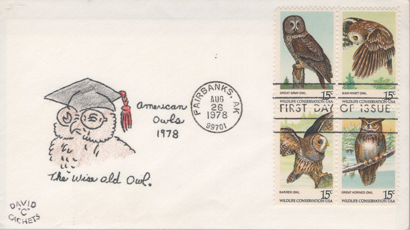 | | 1970s | | 987 | 1763a | 8/26/1978 | American Owls, Block of 4; David 'C' Cachets; HCD | $10.00 |