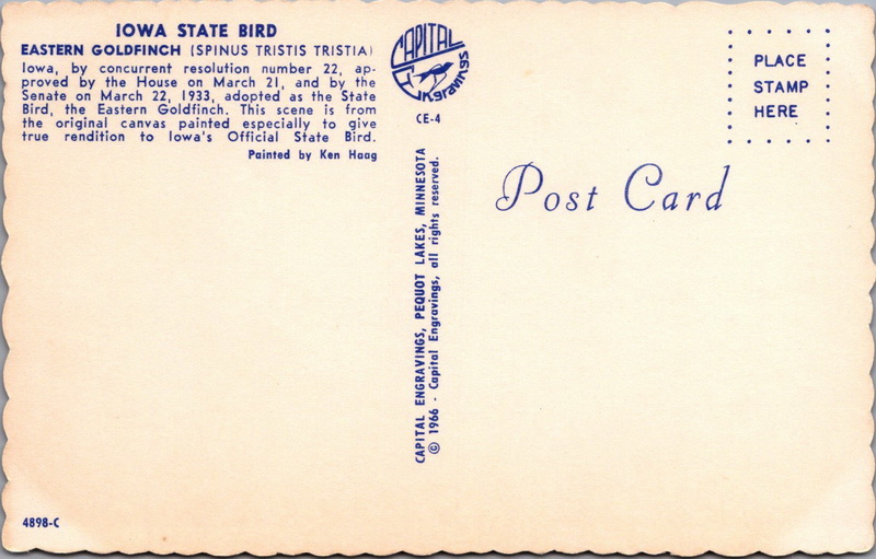 | | 2010s | | 1086 | 4890 | 4/5/2014 | Song Birds, American Goldfinch; PPC by Capitol Engravings of Pequot Lakeas, MN, © 1966 | $15.00 |