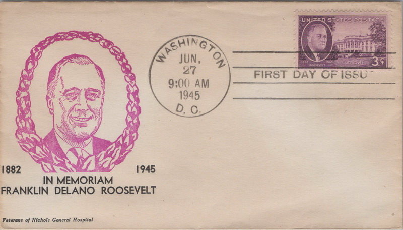 | | First Cachets | | 1138 | 0932 | 6/27/1945 | Franklin D. Roosevelt, White House; Veterans of Nichols General Hospital; M70; black/purple; HC | $35.00 |