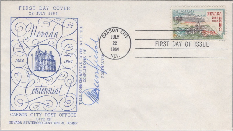 | | First Cachets | | 1145 | 1248 | 7/22/1964 | Nevada Statehood; Carson City Post Office; M12; First Cachet; Signed by Postmaster | $20.00 |
