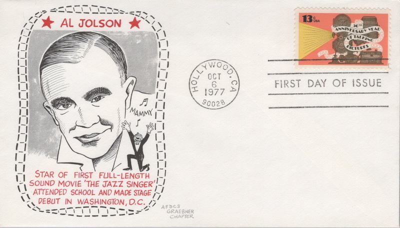 | | First Cachets | | 1161 | 1727 | 10/6/1977 | Talking Pictures; Robert C. Graebner Chapter 17, AFDCS; Al Jolson; First Cachet | $25.00 |