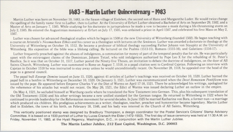 | | First Cachets | | 1176 | 2065 | 11/11/1983 | Martin Luther; Martin Luther Jubilee; with enclosure | $12.00 |