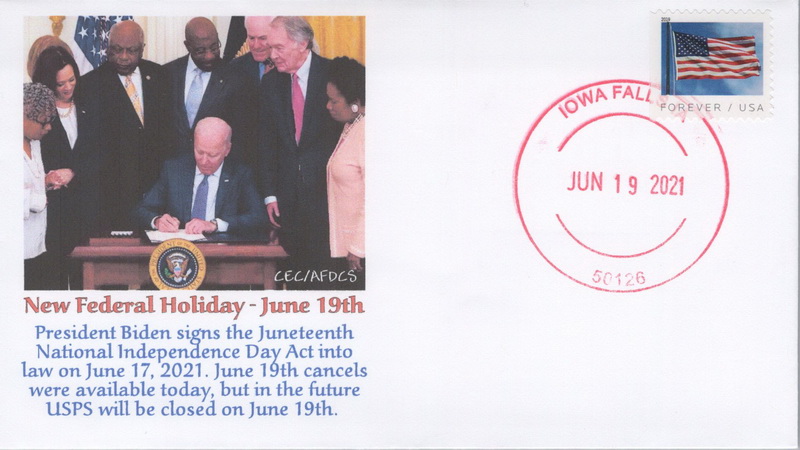 | | Presidential Inaugurations & Related Items | | 1255 | Event | 6/19/2021 | Junteenth New Federal Holiday; CEC/AFDCS; Iowa Falls, IA | $12.00 |