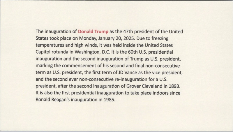 | | Presidential Inaugurations & Related Items | | 1260 | Event | 1/20/2025 | President Trump Inauguration Day; Triple W Cachets; with enclosure; Washington DC 2025 Station; PHC; 4 made | $20.00 |