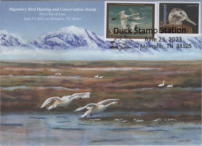 | | Cachetmakers Contest - Winners | | 17 | RW90 | 6/23/2023 | Duck, Tundra Swans; Walter Douglas George (Wally Jr. Cachet), Category 8: Federal or State Duck Covers; First Place | $100.00 |