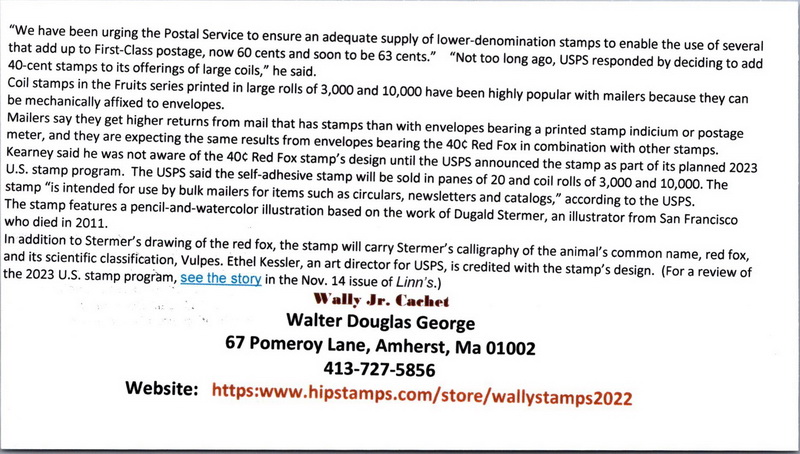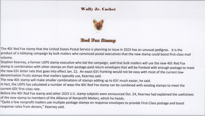 | | Cachetmakers Contest - Other Entries | | 38 | 5742 | 1/5/2023 | Red Fox, Sheet; Wally Jr. Cachet | $12.00 |