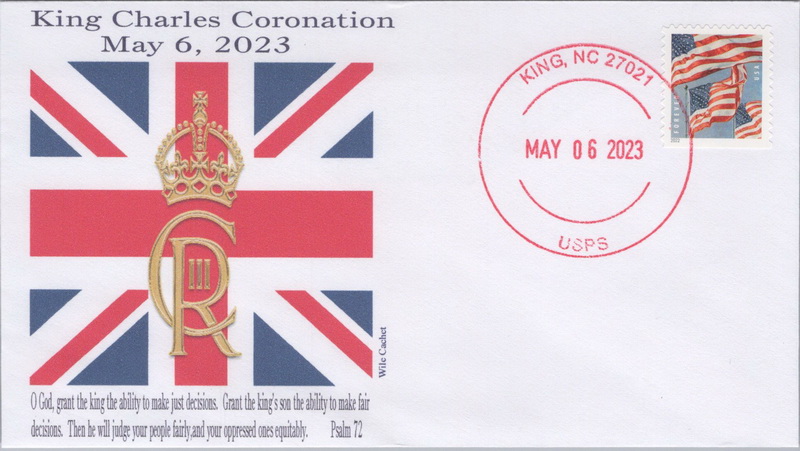 | | Cachetmakers Contest - Event Covers | | 137 | Event | 5/6/2023 | Wile Cachets; King Charles Coronation; King NC | $10.00 |