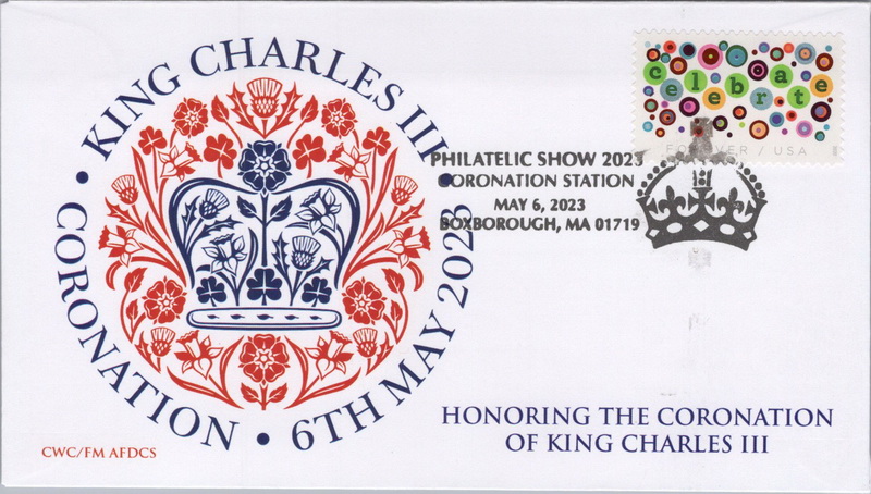 | | Cachetmakers Contest - Event Covers | | 138 | Event | 5/6/2023 | CWC/FM/AFDCS; King Charles Coronation; Boxborough MA Coronation Station | $10.00 |
