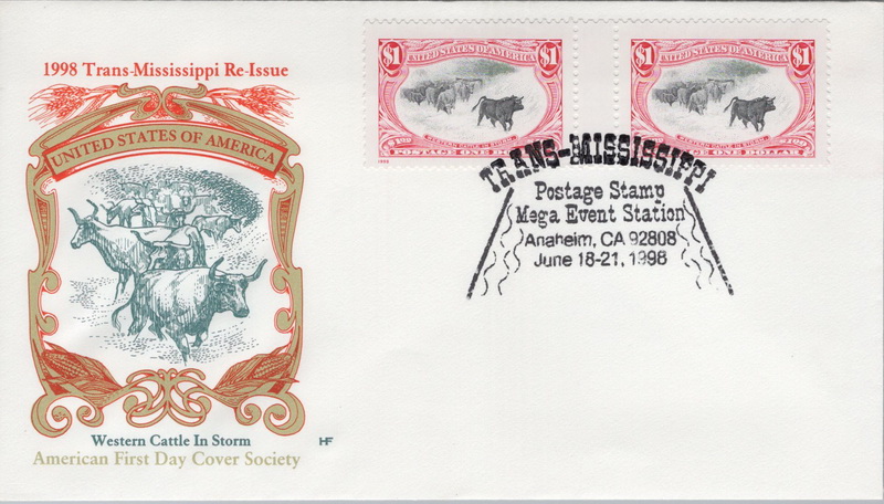 | | American First Day Cover Society | | 166 | 3210a | 6/18/1998 | 1898 Trans-Mississippi Reprint, single; AFDCS; Pair with attached selvage between stamps; printed by House of Farnam; UO Anaheim CA Postage Stamp Mega Event Station | $12.00 |