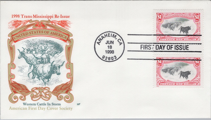 | | American First Day Cover Society | | 167 | 3210a | 6/18/1998 | 1898 Trans-Mississippi Reprint, single; AFDCS; Pair with attached selvage between stamps; printed by House of Farnam | $12.00 |