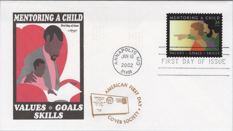 | | American First Day Cover Society | | 168 | 3556 | 1/10/2002 | Mentoring A Child; Artmaster; with AFDCS gold logo; Originally sold for $20.00 each with proceeds going to the AFDCS Youth Scholarship Fund | $20.00 |