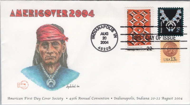 | | American First Day Cover Society | | 169 | 3750 | 8/20/2004 | American Design Series, Navajo Necklace, serpentine die cut 11; AFDCS; Americover 2004; Art by Dave Dube | $10.00 |