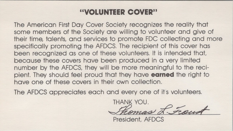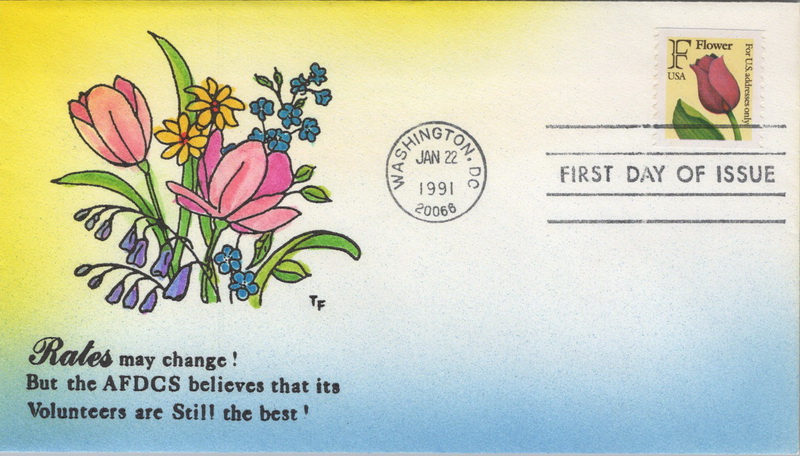 | | AFDCS Volunteer Thank You Covers | | 186 | 2518 | 1/22/1991 | F Flower, Coil; TF Cachets; HPD; 100 made | $30.00 |